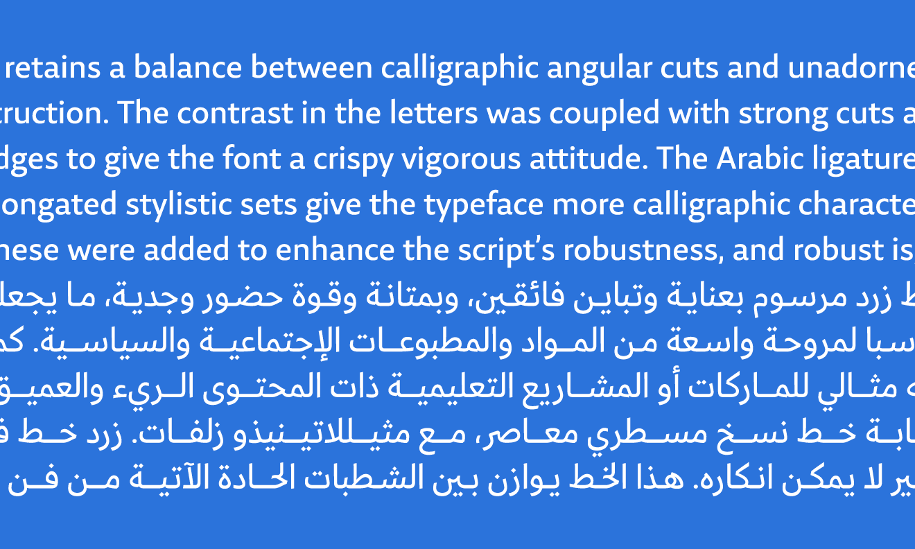 Thus, I developed a sans out of Zarid Serif by removing the serifs, reducing the stroke contrast, changing the proportions and spacing, and edited the kerning. In Arabic, there are no serifs to remove. Instead, Pascal had to tone down the distinct calligraphic style, remove many of the sharp edges and notches, and change letter connections and spacing. We worked simultaneously, sending font files and PDFs back and forth to each other over and over again. We compared them extensively to make sure that Arabic and Latin would play well together.